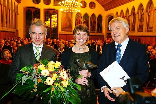 Sylvia von Metzler, Prof. Dr. Volkmar Hansen (rechts), Oberbürgermeister Peter Feldmann; Foto © Wachendoerfer, Frankfurt/Main„Ihr Einsatz, liebe Familie von Metzler, dient der Kultur unseres Landes. Dafür danke ich Ihnen von ganzen Herzen, auch im Namen der Bundesregierung, und gratuliere zu der heutigen Auszeichnung“, so Dr. Ingeborg Berggreen-Merkel, Abteilungsleiterin beim Staatsminister für Kultur und Medien. In ihrem Grußwort überbrachte sie dessen Genesungs- und Glückwünsche und betonte, dass Sylvia und Friedrich von Metzler nicht nur wegen ihres jahrzehntelangen Engagements für Frankfurts Kultur und Wissenschaft ausgezeichnet würden, sondern mit der Maecenas-Ehrung auch das beispielhafte Wirken der Familie von Metzler für das Gemeinwesen, dem diese sich seit Jahrhunderten verbunden fühle, gewürdigt werde: Die Bundesregierung unterstütze die Vergabe der Maecenas-Ehrung gerne. Dies könne jedoch angesichts der überwältigenden Großzügigkeit der Förderer und Mäzene in Deutschland nur eine Geste des Dankes und der Anerkennung sein, die die Hoffnung ausdrückt, dass es auch in Zukunft Menschen geben möge, die sich in selbstloser Weise für unsere Gesellschaft einsetzten.