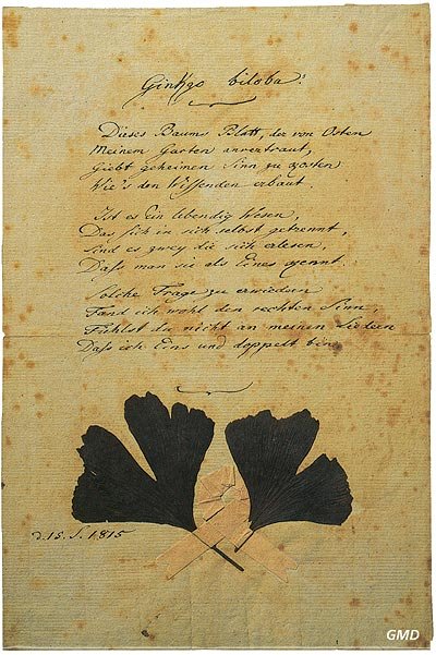 Johann Wolfgang von Goethe, Ginkgo biloba, Eigenhändige Niederschrift seines Gedichts, 15. September 1815, © Goethe-Museum DüsseldorfWeitere AsKI-Institute haben an einem ergänzenden Rahmenprogramm mitgewirkt, wie z.B. das Archiv der Akademie der Künste und das Bauhaus-Archiv, Berlin, sowie die Arbeitsgemeinschaft Friedhof und Denkmal, Kassel. Vorträge und eine Filmreihe sollen die Aktualität des Themas mit Beispielen aus dem 19./20. Jahrhundert dokumentieren.