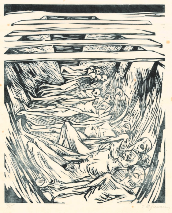 Franz M. Jansen: Massengrab  aus der Mappe ‘Krieg‘, 1917/18, Foto: Akademie der Künste, Berlin, KunstsammlungIm August 1914 ist die Stimmung der bürgerlichen Eliten geprägt von Euphorie, Selbstherrlichkeit und Siegesgewissheit. Der Kriegsbeginn wird von jungen, bürgerlichen Kriegsfreiwilligen als Abenteuer erlebt. Intellektuelle begrüßen die heraufziehende Katastrophe als „den großen, grundanständigen, ja feierlichen Volkskrieg" (Zitat: Thomas Mann). Wirtschaftliche Abhängigkeiten in der bereits globalisierten Welt übersieht man geflissentlich. Befürchtungen, wie sie sich in der Angst vor dem Verlust der Existenzgrundlagen zeigten, werden nicht nur von Politikern und Medien bagatellisiert. Man ignoriert sie genauso wie die Kritiker, die darüber hinaus als „vaterlandslos" diffamiert werden.