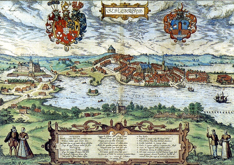 Ansicht der Stadt Schleswig mit Schloss Gottorf, kolorierte  Radierung, 1584, Foto: Stiftung Schleswig Holsteinische Landesmuseen Schloss Gottorf